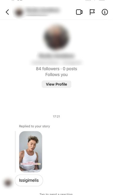 Prieš dvi dienas savo asmeninėje „Instagram“ paskyroje plaukų stilistas Ąžuolas Misiukevičius pasidalino vaizdo įrašu, kuriame matyti įžeidžios žinutės ekrano nuotrauka.