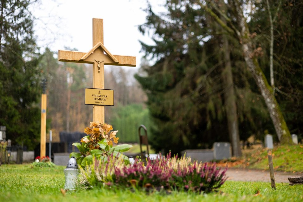 Vytauto Kernagio, Vytauto Šerėno, Arūno Storpirščio, Algirdo-Mykolo Brazausko kapai. Medinis kryželis su rudeninėmis gėlėmis prie neseniai mirusio aktoriaus Vytauto Tomkaus kapo.