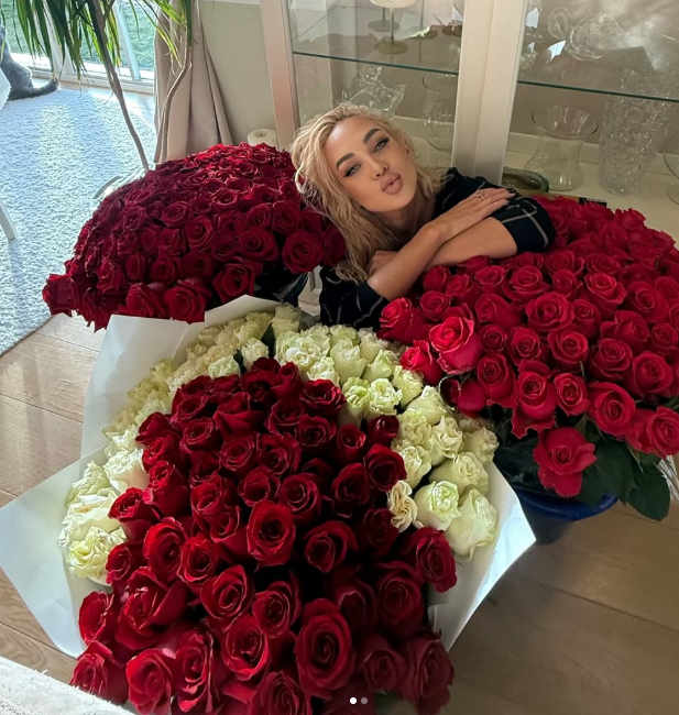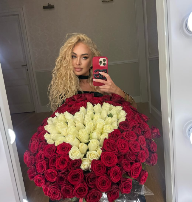 Oksana Pikul šeštadienį savo instagramo ir feisbuko paskyrose pasidalijo nuotrauka, kurioje yra užfiksuota laikantį didžiulę rožių puokštę.