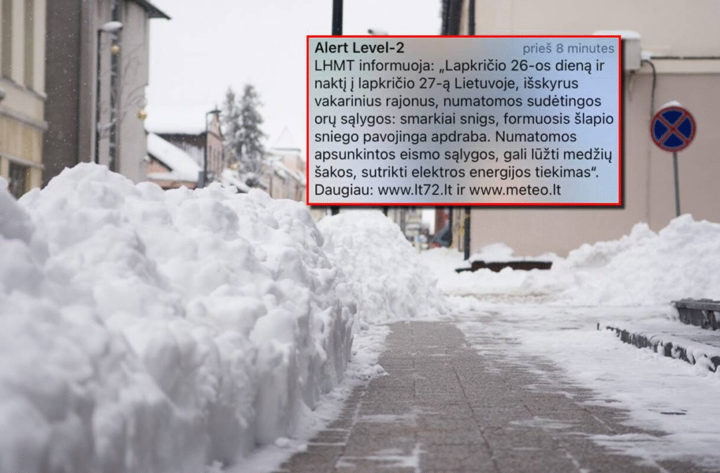 „Lapkričio 26-osios dieną ir naktį į lapkričio 27-ą Lietuvoje, išskyrus vakarinius rajonus, numatomos sudėtingos oro sąlygos: smarkiai snigs, formuosis šlapio sniego pavojinga apdraba. Numatomos apsunkintos eismo sąlygos, gali lūžti medžių šakos, sutrikti elektros energijos tiekimas“, – rašoma išplatintame pranešime.