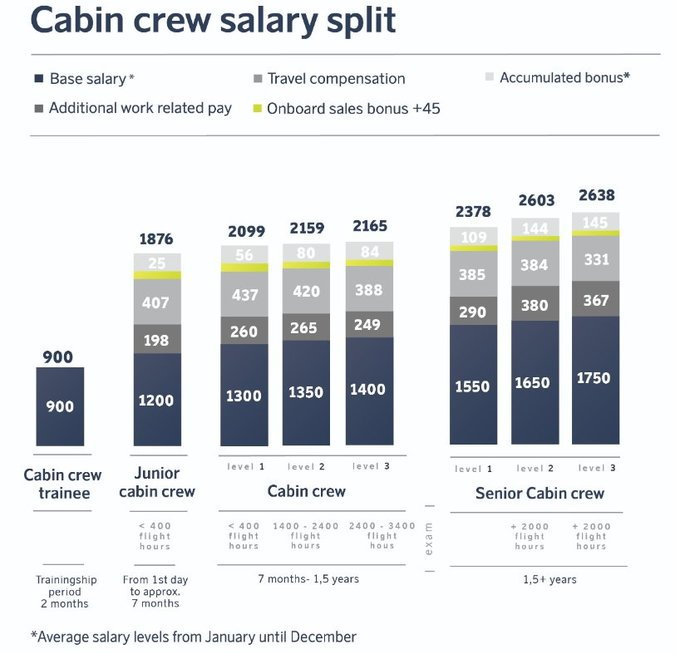Atstovo pateiktais duomenimis (remiantis vidutine alga nuo sausio iki gruodžio mėn.), pradedantysis keleivių salono įgulos praktikantas (angl. cabin crew trainee) gali pretenduoti tik į bazinį atlyginimą, kuris yra 900 eurų. O mokymai trunka 2 mėnesius.