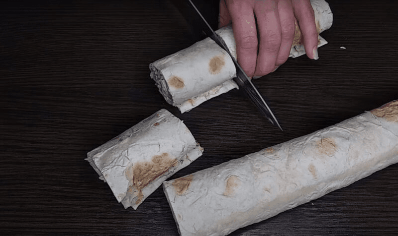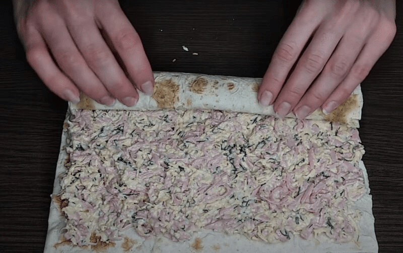 Šį mišinį dėkite ant lavašo lakšto ir susukite lavašą į ritinį.