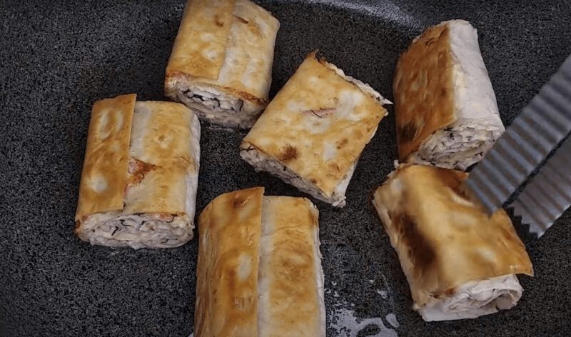 Keptuvėje įkaitinkite augalinį aliejų ir ant vidutinės ugnies apkepkite vyniotinius iš visų pusių iki auksinės rudos spalvos.