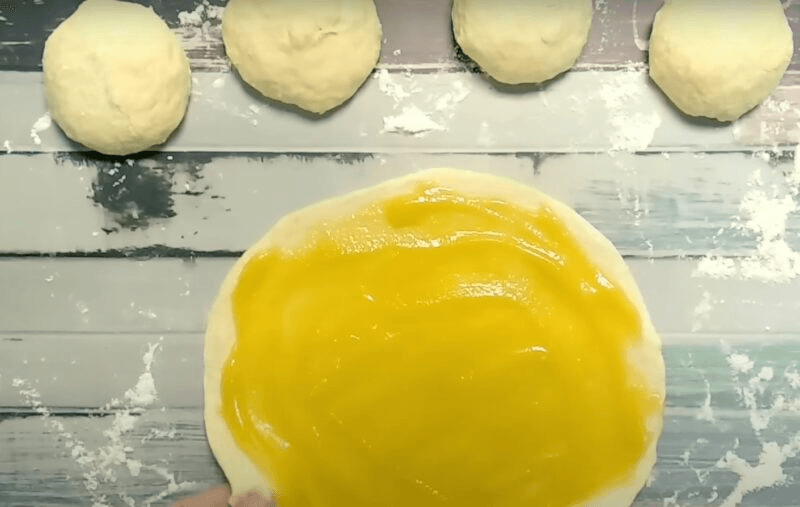 Iš kolobokų iškočiokite plokščius paplotėlius, kiekvieną ištepkite tiršta margarino tešla.