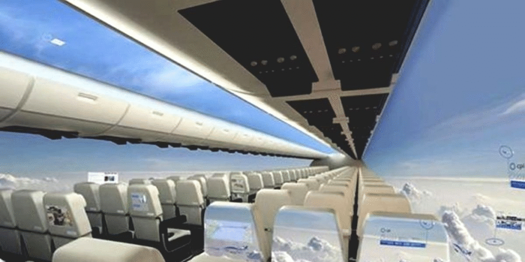 Ateities lėktuvai bus išvis be langų. Vietoj to jie turės sensorinius OLED ekranus per visą korpuso ilgį. Tai yra kiekvienas keleivis turės savo vietą prie virtualaus lango!