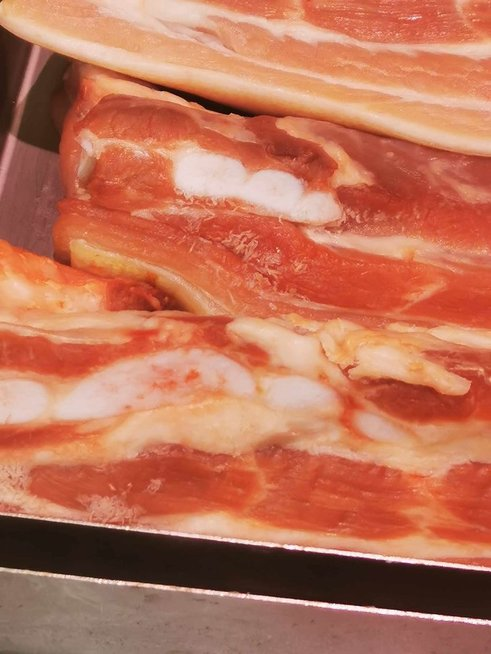 Nuotraukoje matomą mėsą gauname dideliais skerdenos gabalais, parduotuvėse juos smulkiname, pjaustome, tad nuotraukoje matomi dariniai ant mėsos yra kaulų drožlių likučiai, kuriuos nedelsdami pašalinome.