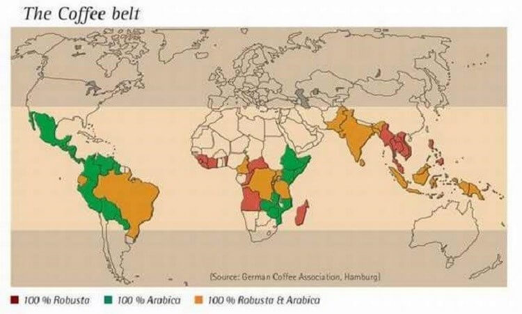 Kava auga tik tose šalyse, kurios žemėlapyje pažymėtos spalvomis. Jos yra taip tankiai išsidėsčiusios aplink pusiaują, kad paprastai vadinamos „kavos juosta“.