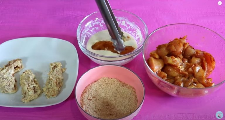 Mes panardinome kiekvieną mėsos gabalėlį į tešlą, tada sugriūname krekeriuose ir kepame karštą augalinį aliejų.
