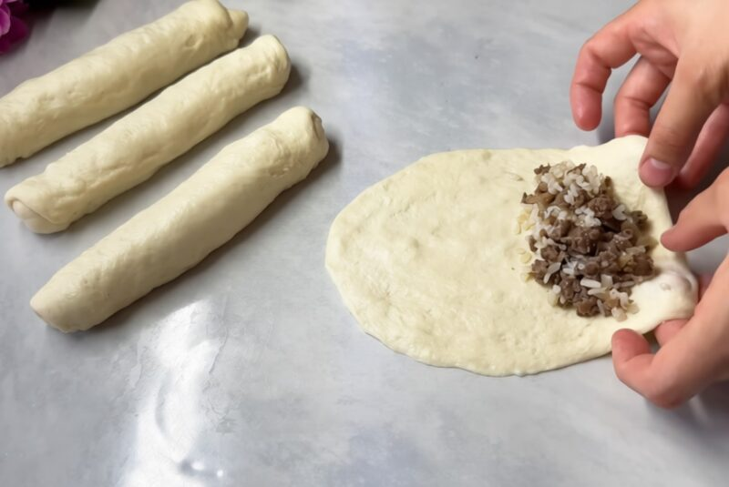 Sukite kelius rankomis į plonus stačiakampius sluoksnius, išdėliokite kiekvieno krašto užpildą. Įdarą suvyniokite į ritininius galus viduje.