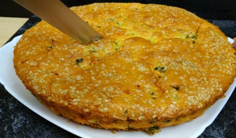 Mes išdėstome įdarą, išlyginame jį, užpilame antrąją bandymo dalį, bandydami tai padaryti tolygiai. Jei norite, pabarstykite sezamu.