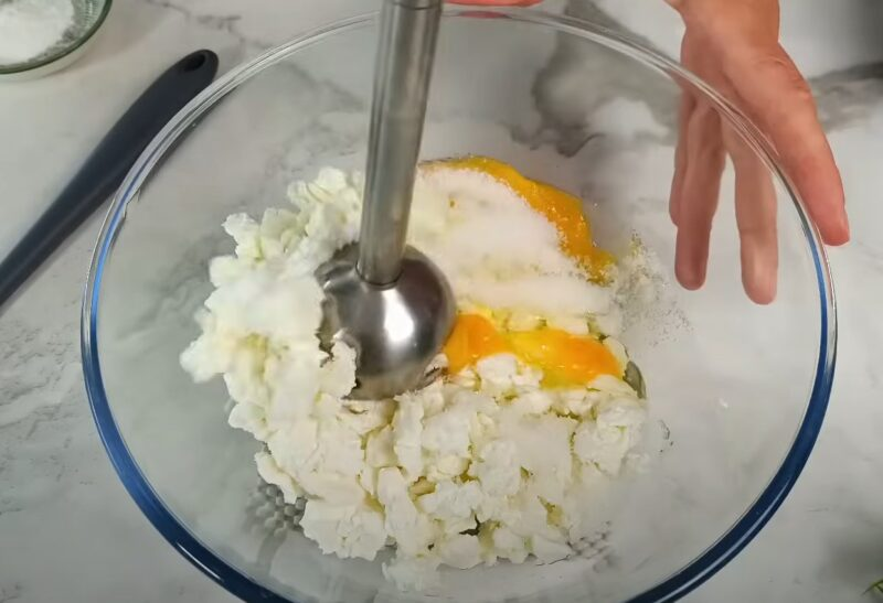 Varškėje sulaužykite kiaušinius, supilkite cukrų, druską ir vanilę, plakkite povandeniniu maišytuvu. Mes sijojame varškės masę miltų ir kepimo miltelių, sumaišykite minkštą šiek tiek lipnią tešlą.