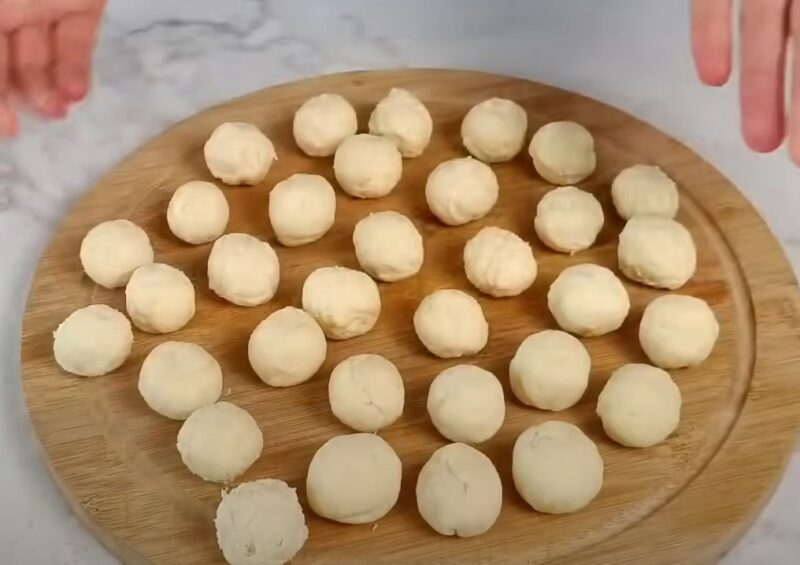 Mes dalijame tešlą į keletą identiškų dalių, išvyniojame plonas dešreles. Dešreles dalijame į mažas dalis, balionų formą.