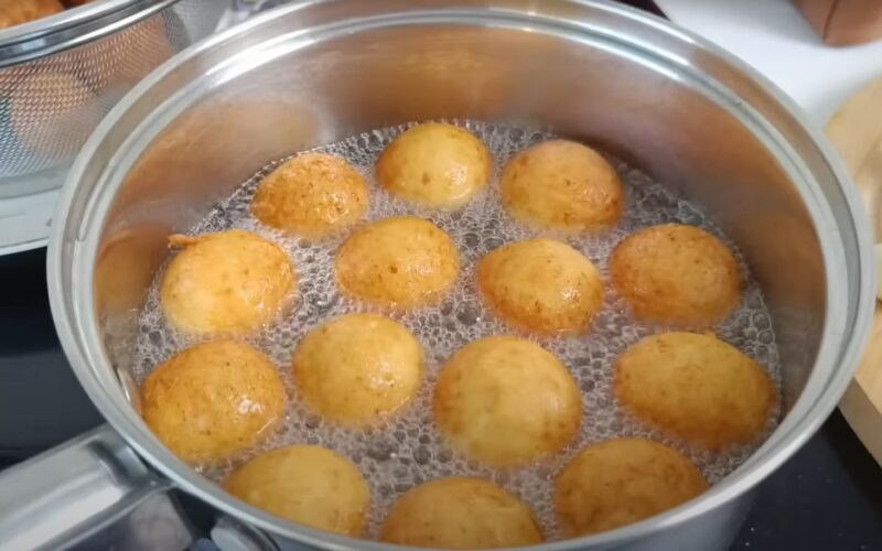 Puode mes šildome 300 ml augalinio aliejaus iki 175 laipsnių temperatūros. Įdėkite rutulius į aliejų ir kepkite iš abiejų pusių į skaistališką auksinę plutą.