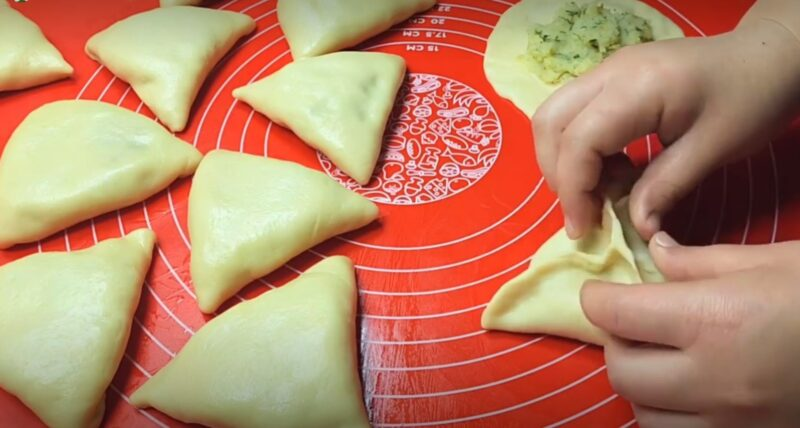 Tešla turi būti padalinta į mažas kilpas, kurios turi būti suvyniotos į pyragus. Kiekvienoje tortilijoje mes išdėstome užpildą ir suspaudžiame tešlos kraštus.