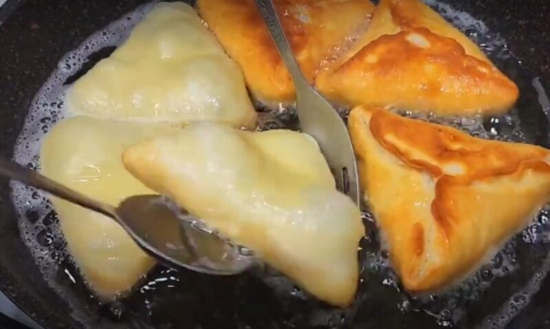Karšto su augalinio aliejaus keptuve, mes dedame pyragus ir kepame iš abiejų pusių į skaistalų plutą.
