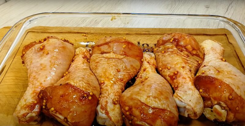 Vištienos kojos pabarsto druska ir paprika, laisto sojos padažą. Į blauzdas įmaišyti garstyčias, išmaišyti ir trumpam palikti marinuotis.