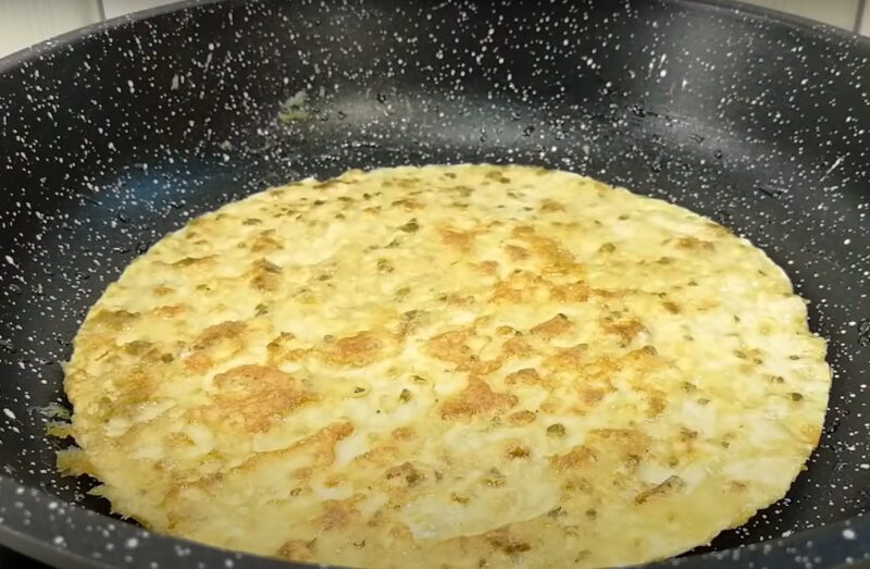 Apgaubti lavašą kiaušinių mišinyje. Mes išdėliojame lavšą keptuvėje, kepame porą minučių iš abiejų pusių. Pakartokite algoritmą su likusia apvaliojo lavašo dalimi.