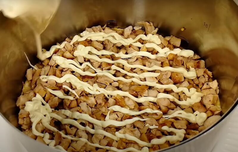 Konditerijos gaminių žiede mes renkame užkandžių pyragą. Mes įdedame pirmąjį lavašą į apačią, pabarstykite vištienos mėsą – 1⁄2 dalies.