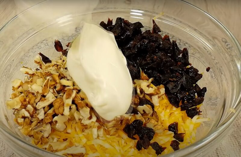 Sumaišykite sūrio trintuvą ant mažų kaktelių, supjaustytų slyvų, susmulkintų graikinių riešutų. Sumaišykite sūrį, slyvas ir riešutus, užpildykite padažu.