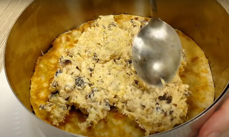 Ant lavašo mes išdėliojame skrudintus grybus su svogūnais, sutepkite majonezu. Mes uždengiame grybų sluoksnį lavašu.