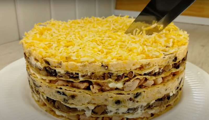 Dėl to užkandžių pyragas puikiai išlaiko formą be konditerijos žiedo. Šis pyragas nėra tipiškas kepenys, todėl jis paragaus svečius atostogų metu.