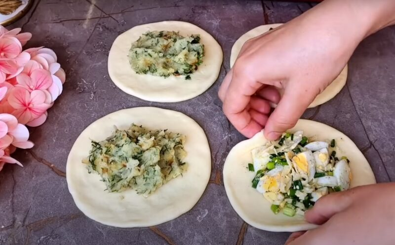 Kiekvieną kelį sudėkite į mažą apvalų pyragą, kur ant stalo uždedame šaukštą kiaušinio ar bulvių įdaro.