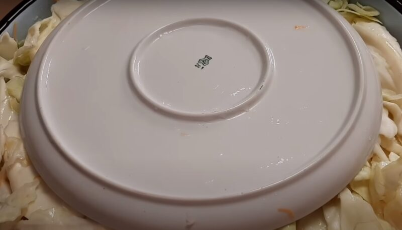 Lapus apibarstykite druska, toliau sluoksniuokite sluoksniuotus kopūstų sluoksnius, tamp. Ant kopūstų viršaus išdėliokite lapus, uždenkite maždaug 5 kg polinkiu.