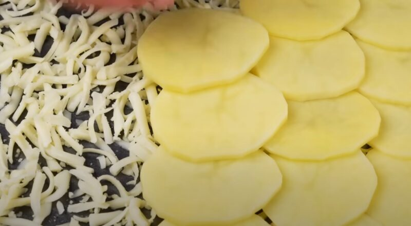 Bulves išvalykite, supjaustykite plonomis lėkštėmis. Ant sūrio sluoksnio uždėkite bulvių lėkštes, persidengiančias.