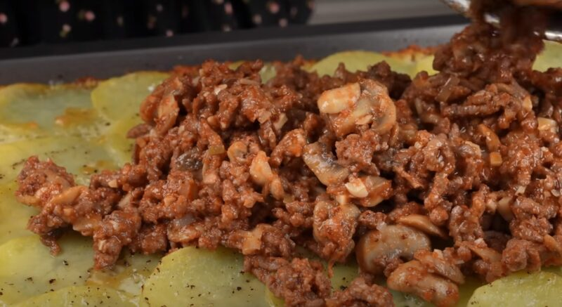 Kepkite bulves orkaitėje 200 laipsnių 30 minučių. Keptuvėje mes kepame smulkintą mėsą ant vidutinės ugnies 7 minutes.