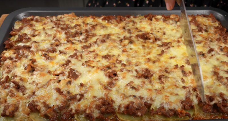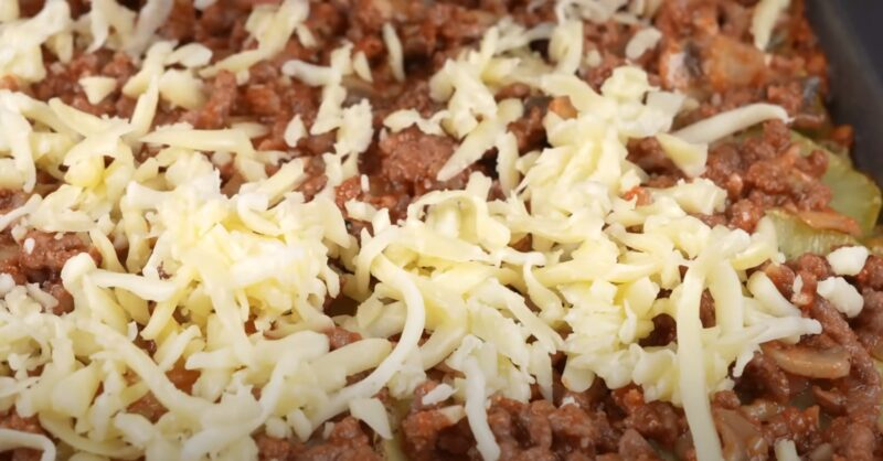 Pabarstykite sūrio sluoksnio maltos mėsos likučius. Kepkite indą 15 minučių orkaitėje.