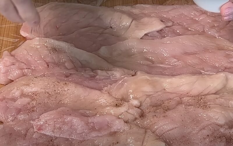 Kiekviena vištienos filė yra padalinta į du plonus kepsnius, sumušti plaktuku ar peiliu. Įdėkite kepsnius ant maisto plėvelės šiek tiek sutaptų.