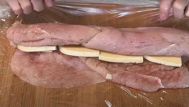 Mes dedame sūrio plokšteles ant mėsos sluoksnio, suvyniojame sūrį į vištienos ritinį.