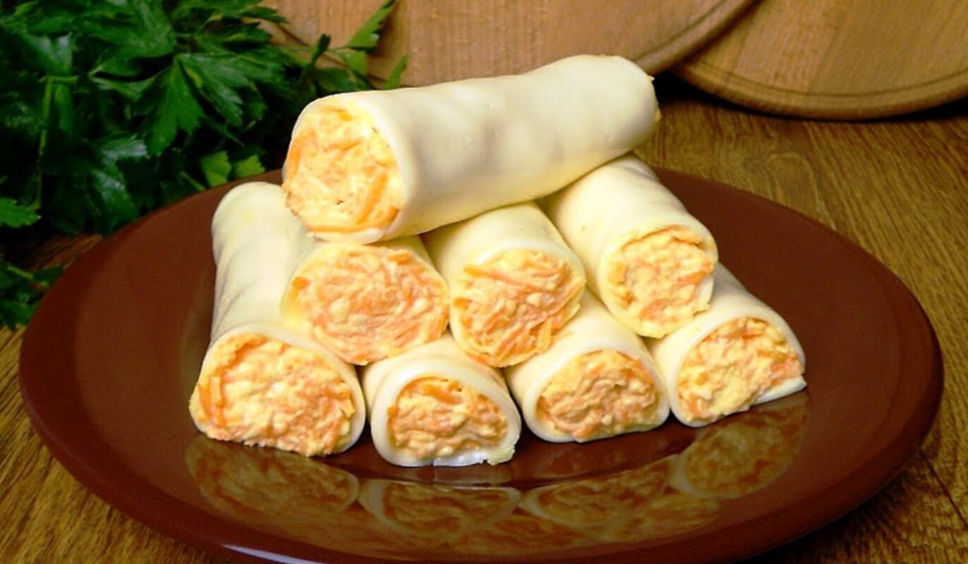 Ant stalo mes išdėstome sūrio plokšteles, ant kiekvieno krašto, uždėto ant šaukšto morkų įdaro. Įdarą suvyniojame į sūrio lėkštes, gauname ruletę.