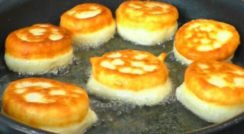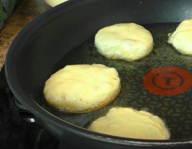 Palikite tešlą 10 minučių šilumos. Keptuvėje, kurioje šildome augalinį aliejų, aliejaus sluoksnis turėtų būti 5 mm virš dugno.