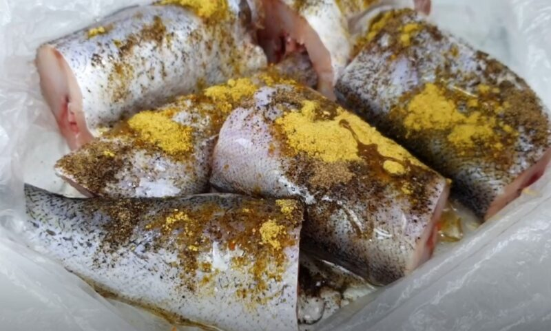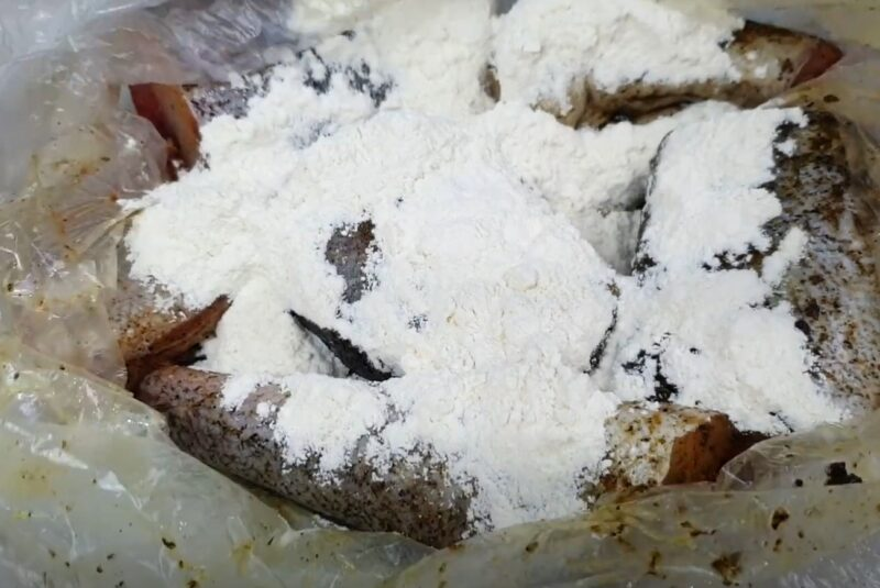 Mes pilame polock prieskonius su augaliniu aliejumi, pakuotė yra susieta ir suplakta. Mes pririšame maišelį ir pabarstome žuvį miltais, kaklaraiščiu ir vėl purtome.