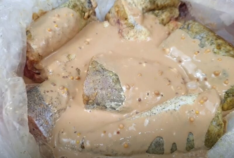 Sumaišykite grietinę su sojos padažu ir garstyčiomis, supilkite į žuvį į maišelį, vėl suplakite. Neatidarykite pakuotės, nuimkite žuvų marinavimą 20 minučių.