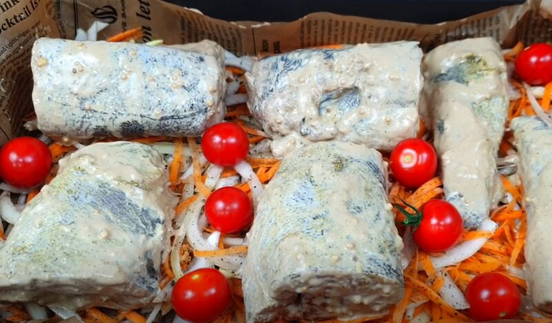 Supjaustykite česnaką plonomis lėkštėmis, paskleiskite ant svogūnų ir morkų, pabarstykite baziliku ir druska. Įdėkite svogūnų pagalvę marinuotą žuvį ir vyšnių pomidorus.