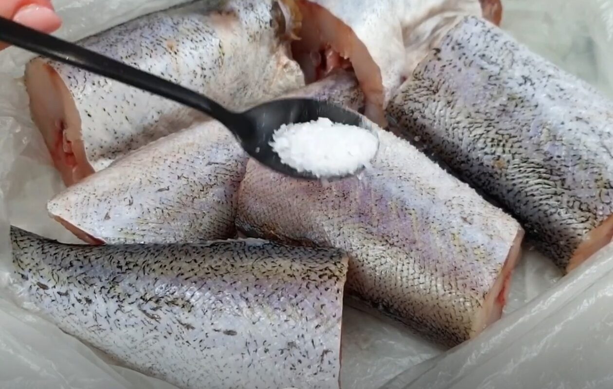Iškirpkite išvalytą intrą, nuplautą poloku, į didelius gabalus. Mes dedame žuvį į celofano maišelį, pabarstome 1⁄2 su šaukštu druskos, juodųjų pipirų ir žuvies prieskonių.
