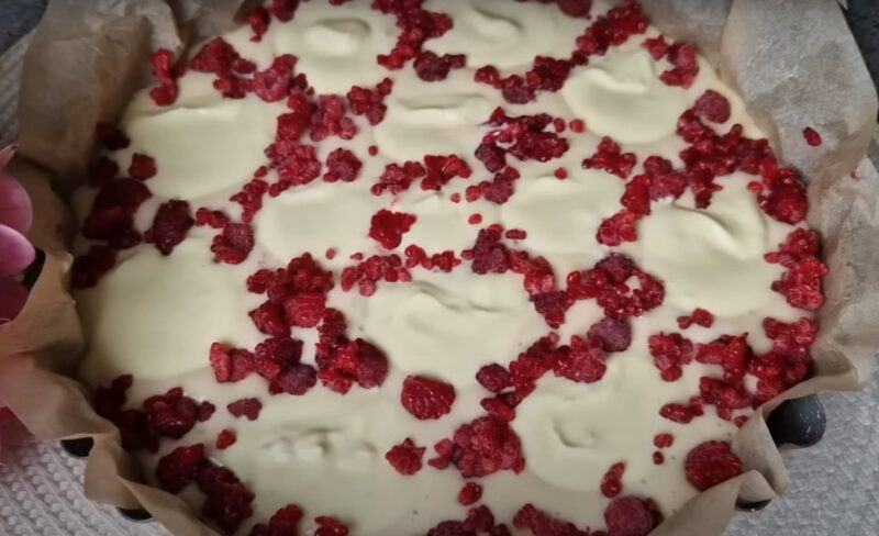Ant tešlos paviršiaus sudėkite varškės mišinį su salelėmis.