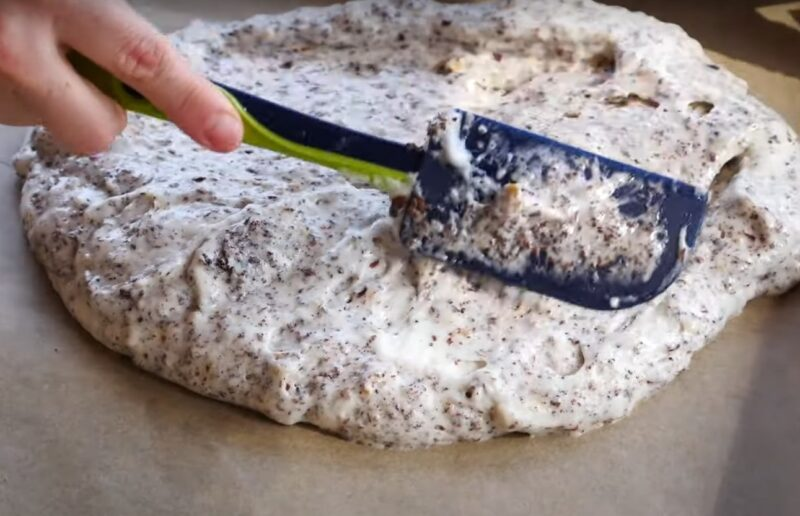 Įtrinkite didelį arba mažą šokolado ir riešutų trintuvą, sumaišykite su aguonomis. Mes supilame mišinį į tešlą, uždedame tešlą ant pergamentu padengtos plokštės ir ištempiame jį ant viso paviršiaus.