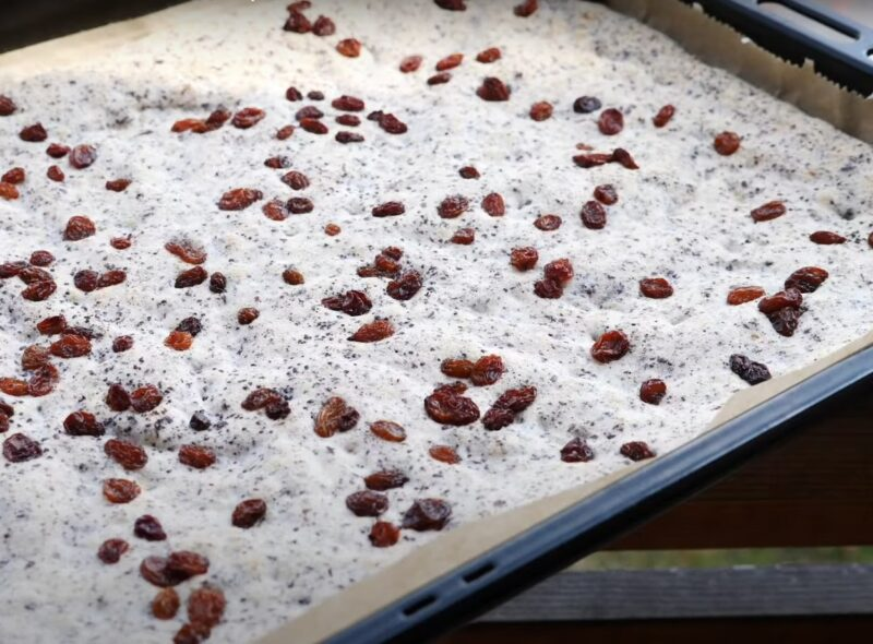 Tešlą apibarstykite razinomis ir kepkite 180 laipsnių kampu 10 minučių.