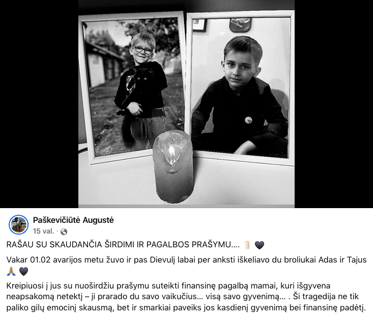 Kreipiuosi į jus su nuoširdžiu prašymu suteikti finansinę pagalbą mamai, kuri išgyvena neapsakomą netektį – ji prarado du savo vaikučius… visą savo gyvenimą… Ši tragedija ne tik paliko gilų emocinį skausmą, bet ir smarkiai paveiks jos kasdienį gyvenimą bei finansinę padėtį.
