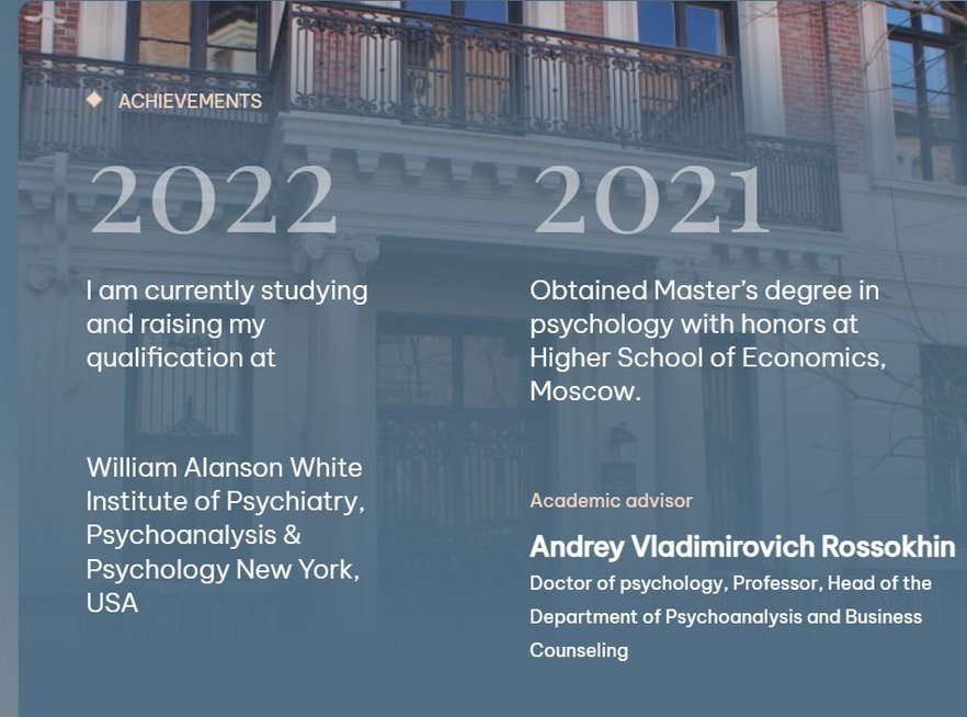 Remiantis informacija, jos akademinis patarėjas buvo Andrejus Vladimirovičius Rosokhinas –psichologijos mokslų daktaras, profesorius, Psichoanalizės ir verslo konsultavimo katedros vedėjas.