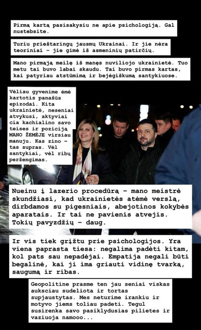 Naujienų portalas tv3.lt primena, kad D. Barkutė Instagramo istorijoje pateikė savo poziciją apie Ukrainą ir šios šalies prezidento žmonos išvaizdą.