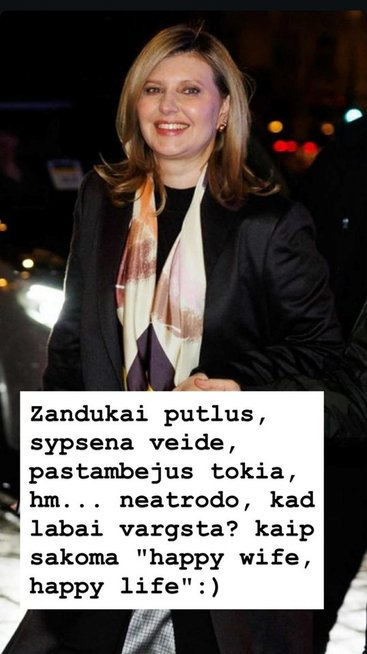 Kiek vėliau ji pakomentavo ir O. Zelenskos išvaizdą, kuri pasak jos, pasikeitusi: „Žandukai putlūs, šypsena veide, pastambėjus tokia… Neatrodo, kad labai vargsta? Kaip sakoma: „happy wife, happy life.“