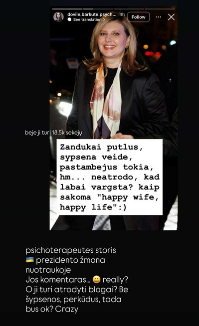 „Psichoterapeutės storis. Ukrainos prezidento žmona nuotraukoje. Jos komentaras… Really? O ji turi atrodyti blogai? Be šypsenos, perkūdus, tada bus ok? Crazy“, – instagrame rašė ji ir prabrėžė, kad Dovilė Barkutė  soc. tinkle turi 18,5 tūkst. sekėjų.