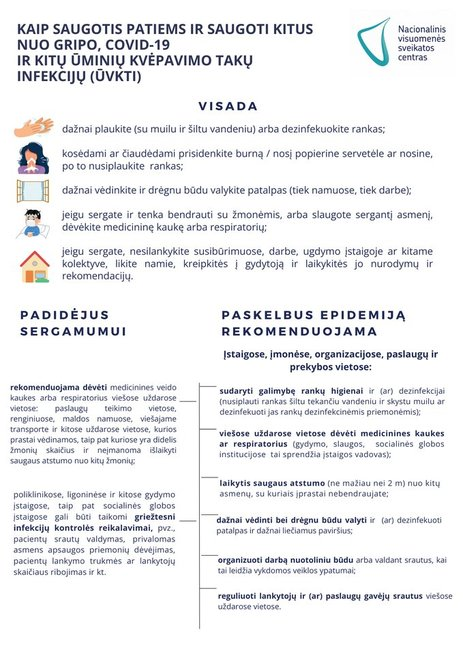 NVSC specialistai primena, kad sergamumas gripu intensyvėja, todėl itin svarbu kruopščiai laikytis higienos taisyklių: plauti rankas, jei nėra galimybės nusiplauti – jas dezinfekuoti; vėdinti ir drėgnu būdu valyti patalpas; laikytis kosėjimo, čiaudėjimo etiketo – prisidengti burną ir nosį vienkartine servetėle arba tai daryti į sulenktą alkūnę.