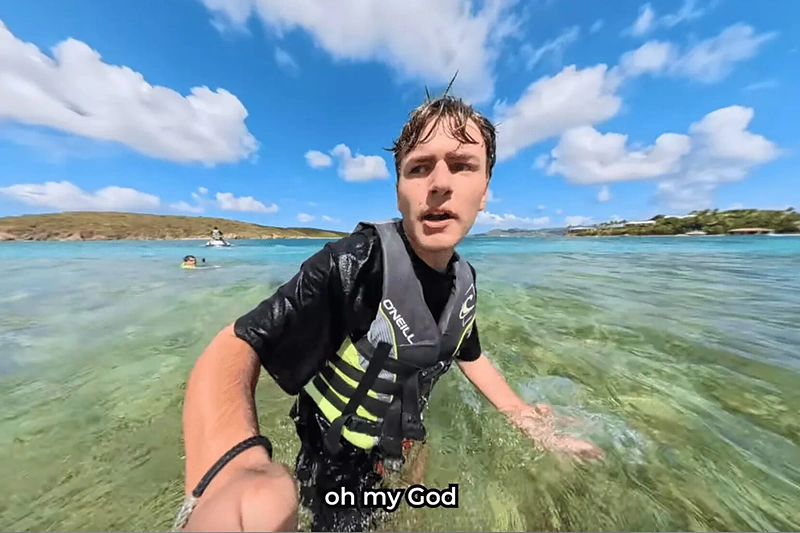 Tiesa, jam nepavyko pasivaikščioti po salą, bet krantą jis pasiekė. Visgi, bandant išsilaipinti jis kojas susibadė į jūros ežius. Nepaisydamas skausmo jis palietė žemę, bet toliau salą apžiūrinėjo iš savo vandens motociklo, kuris buvo prie pat kranto.
