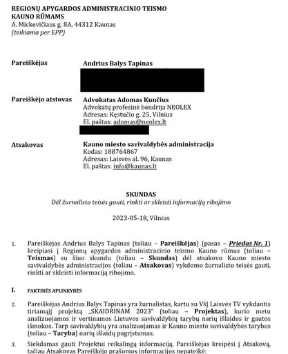 Regionų apygardos administracinio teismo Kauno rūmams šiandien įteiktas Neolex advokatai parengtas skundas. Atsakovas – Kauno miesto savivaldybės administracija“, – rašo jis.