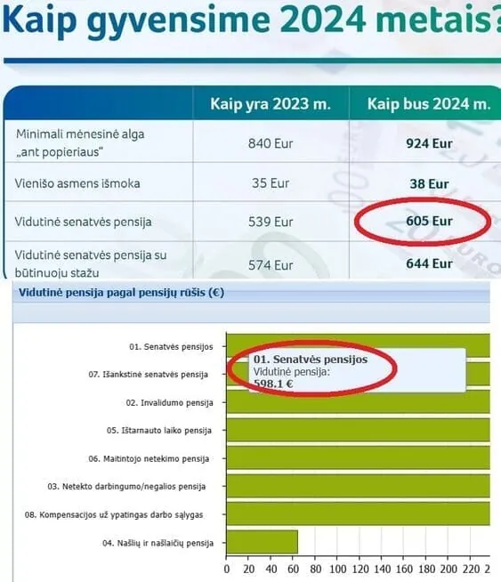Socialinės apsaugos ir darbo ministerija, „Sodra“, taip pat politikai džiaugėsi ir žadėjo, kad 2024 m. vidutinė senatvės pensija padidės iki 605 eurų. Tačiau pačios „Sodros“ duomenys rodo, kad pernai vidutinė pensija Lietuvoje buvo 597 eurai.